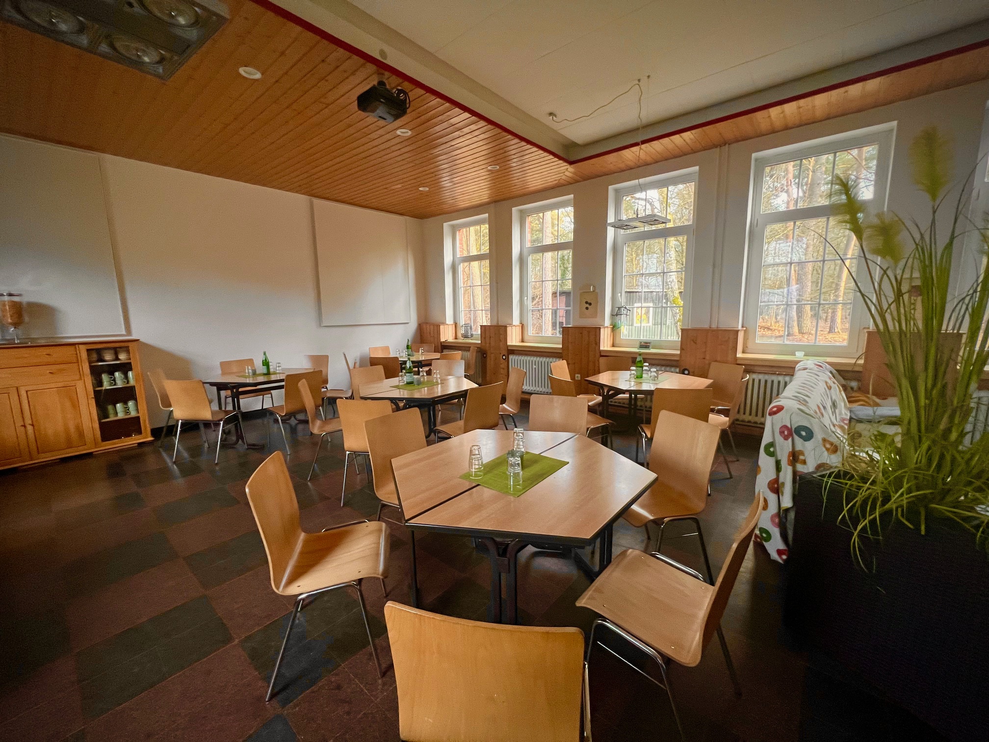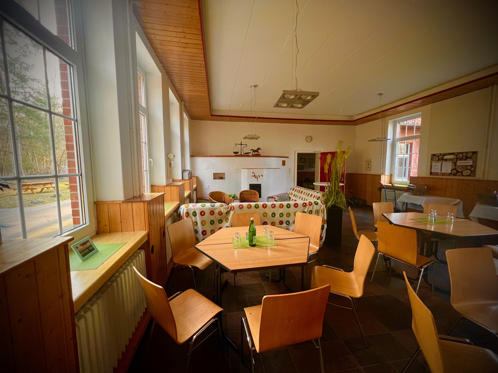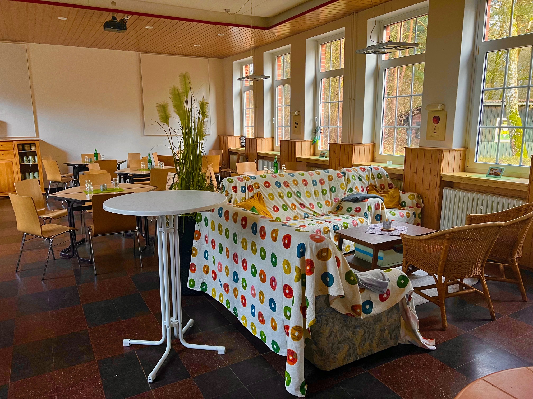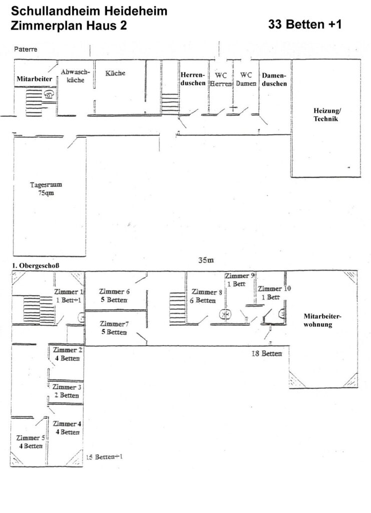 Im Haus zwei sind neben der Küche auch die Sanitäranlagen für den Zeltplatz, ein Tagesraum und im Obergeschoß, im vorderen Flügel, ein Betreuerzimmer, 4 Mehrbettzimmer mit insgesamt 15 Betten und ein kleiner Chill-Bereich untergebracht.