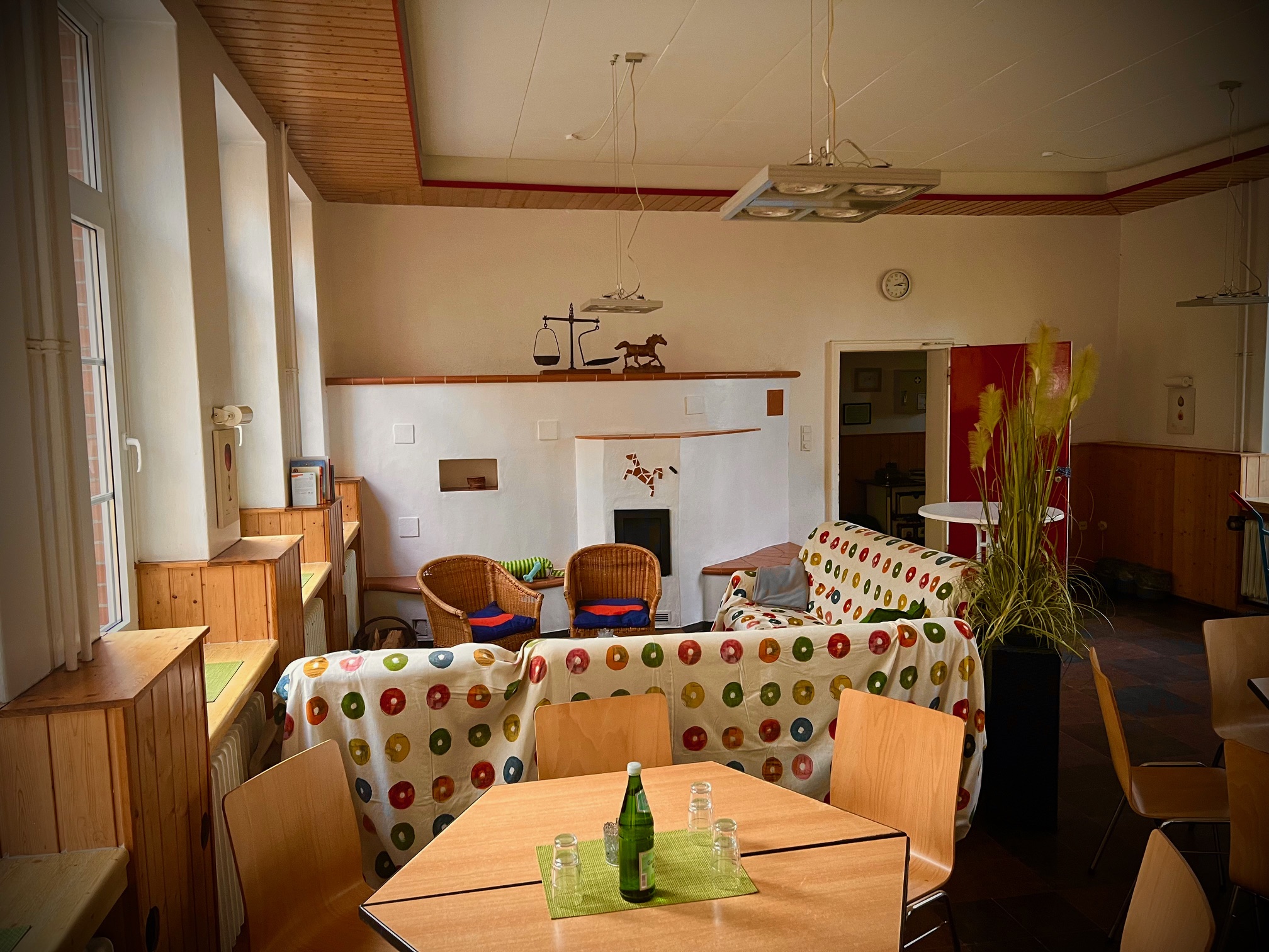 Im Obergeschoß, im hinteren Flügel, sind zwei weitere Betreuerzimmer und drei Mehrbettzimmer mit insgesamt 18 Betten und ein Freizeitbereich mit Kicker untergebracht.